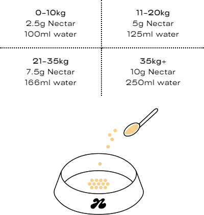 • Scoop the powder according to your dog’s body weight.